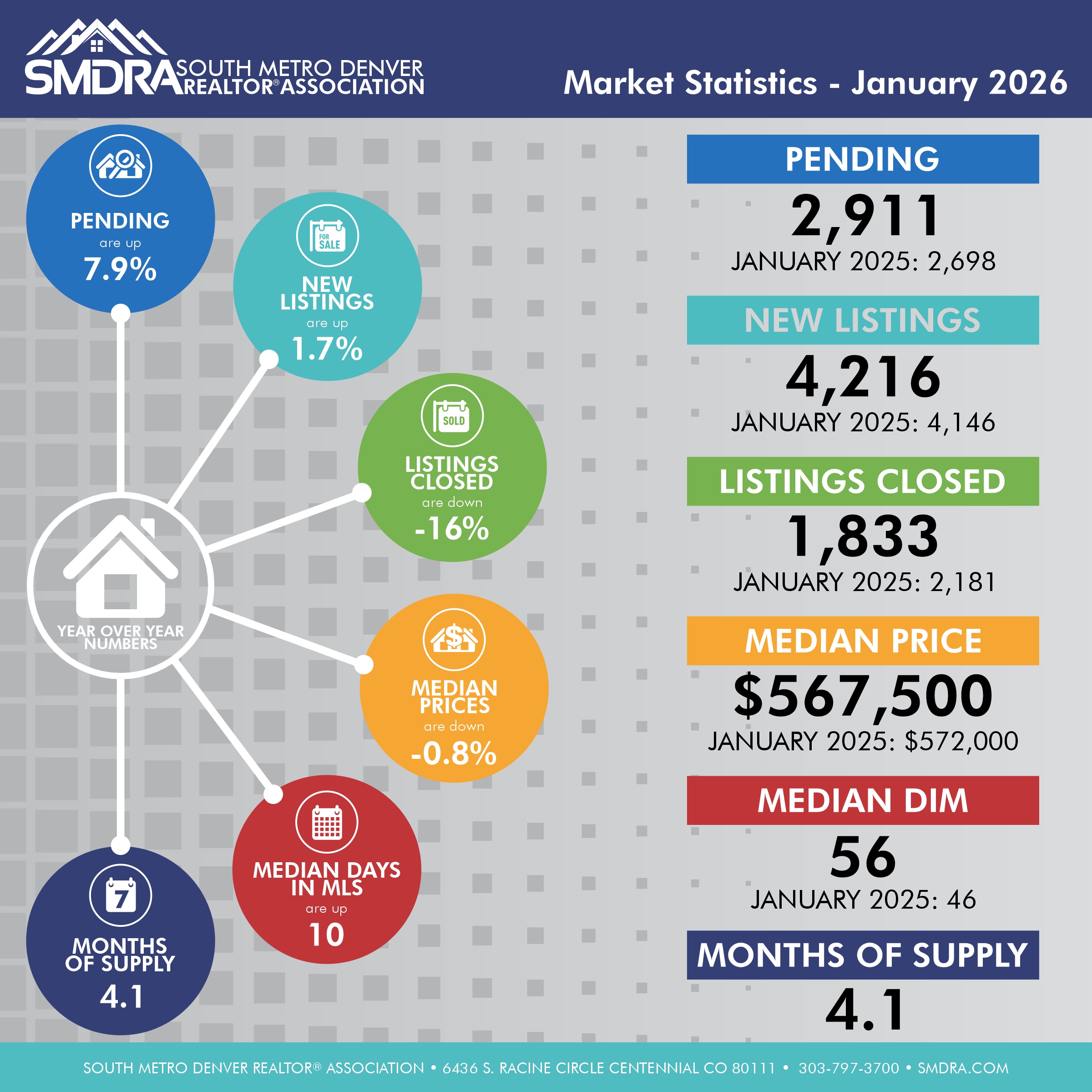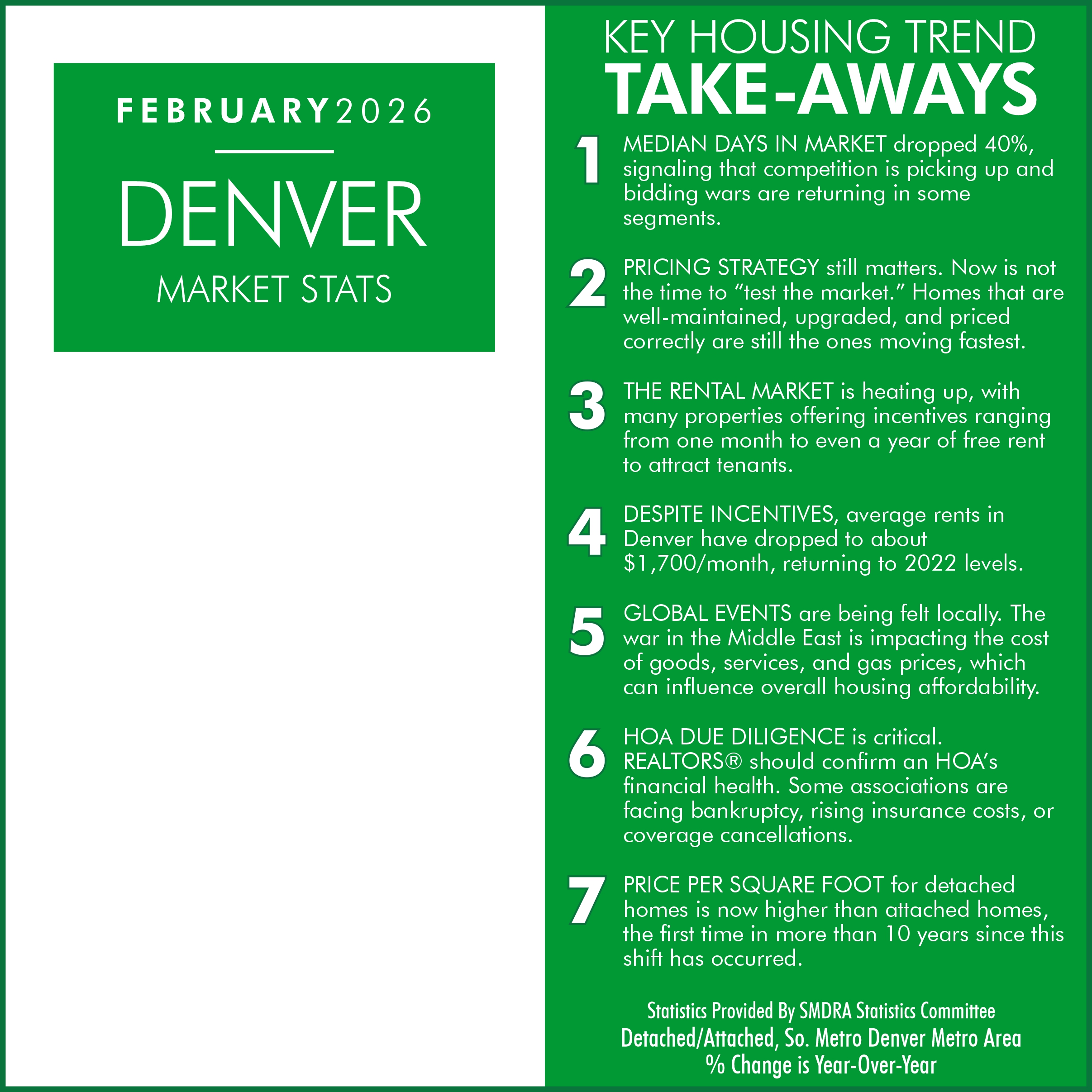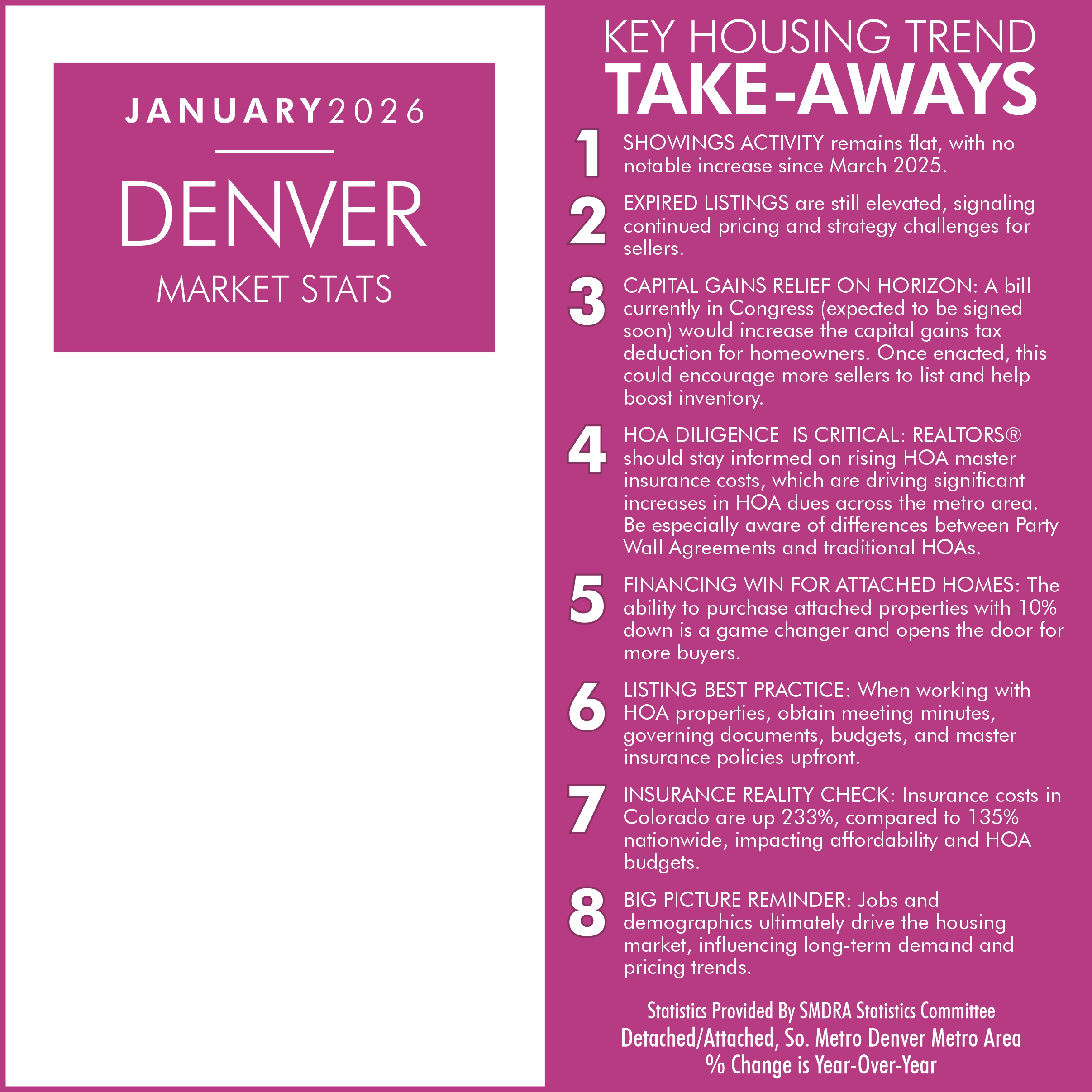 SMDRA uses a 7 County Metro for all Statistical information provided unless otherwise specified, which includes: Adams, Arapahoe, Broomfield, Denver, Douglas, Elbert, and Jefferson counties.